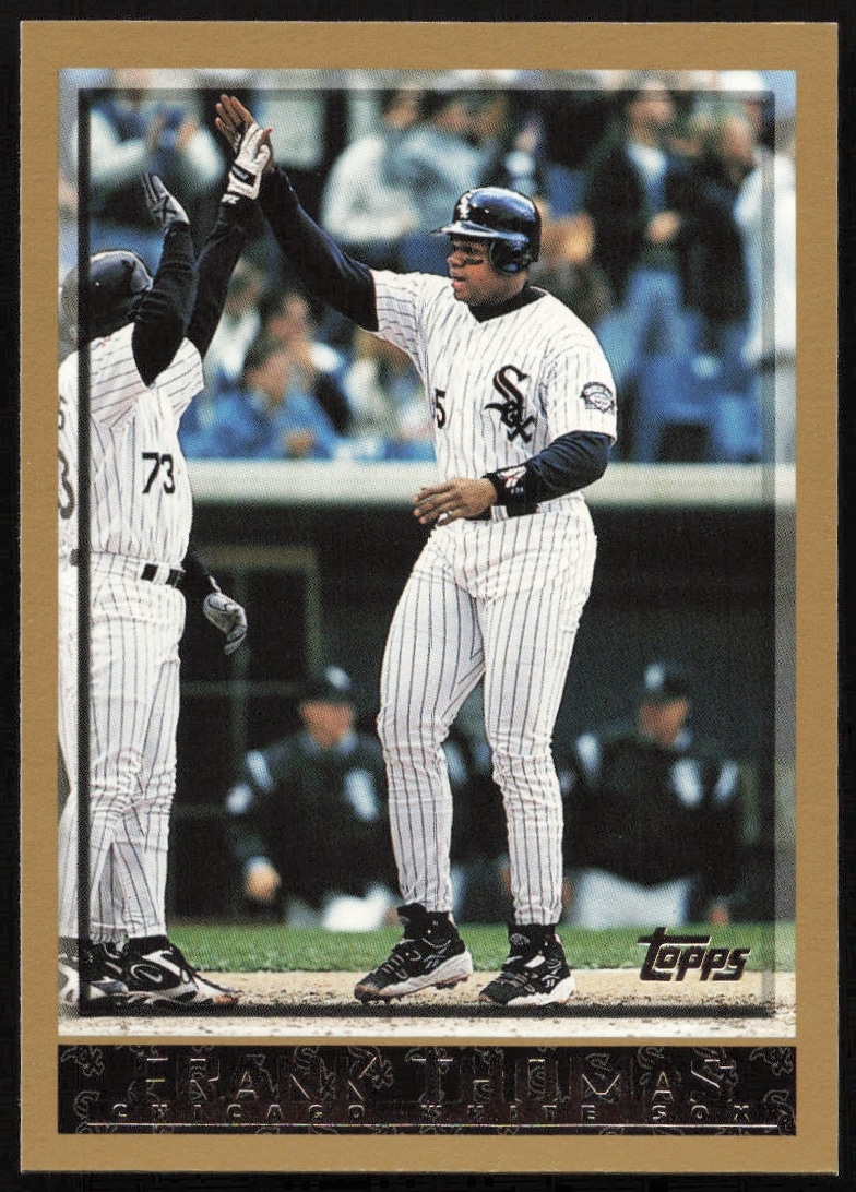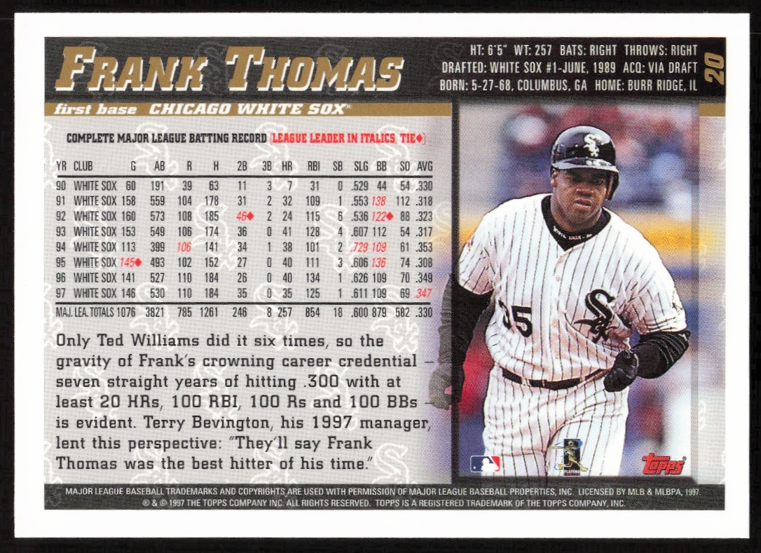 This Baseball card, from 1998 is part of the Topps card set. Frank Thomas is featured and has a card number of 20.