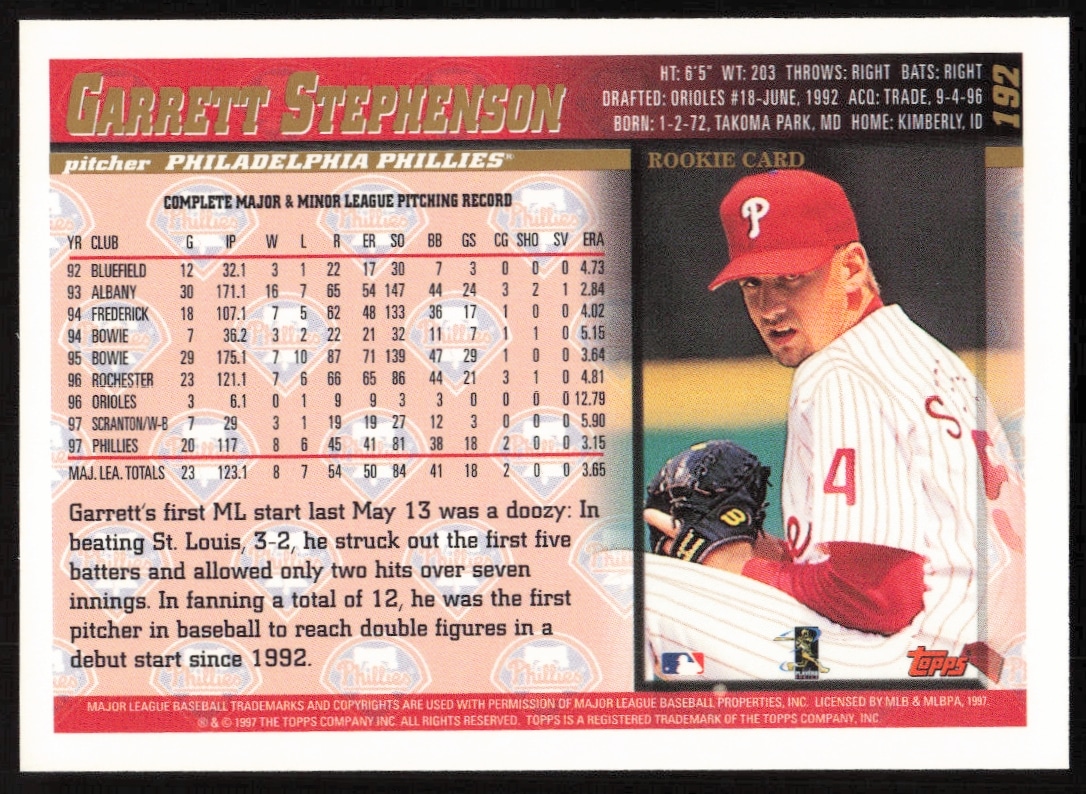 This Baseball card, from 1998 is part of the Topps card set. Garrett Stephenson is featured and has a card number of 192.