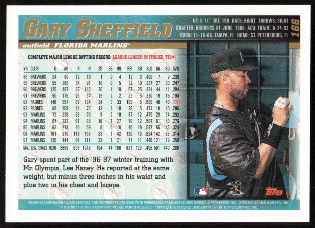 This Baseball card, from 1998 is part of the Topps card set. Gary Sheffield is featured and has a card number of 166.