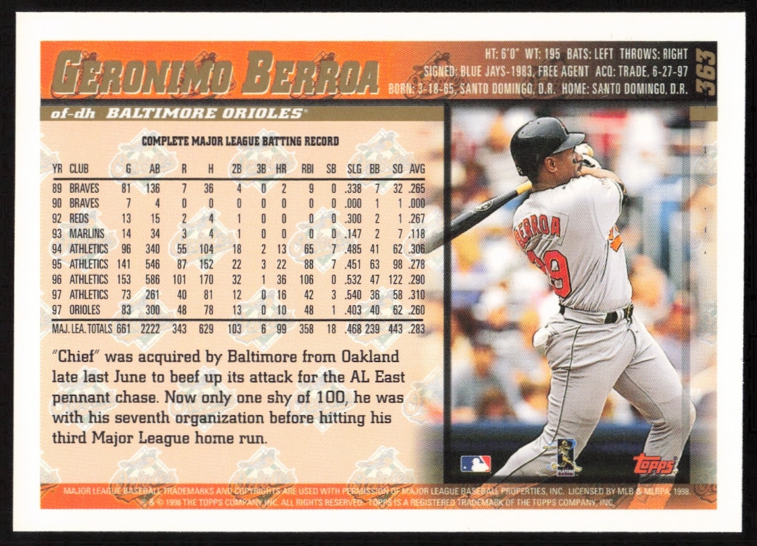 This Baseball card, from 1998 is part of the Topps card set. Geronimo Berroa is featured and has a card number of 363.