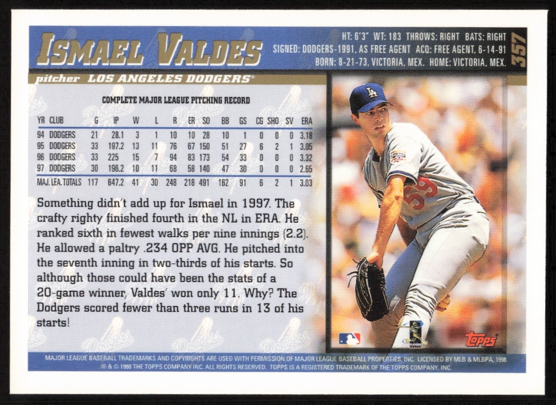 This Baseball card, from 1998 is part of the Topps card set. Ismael Valdes is featured and has a card number of 357.