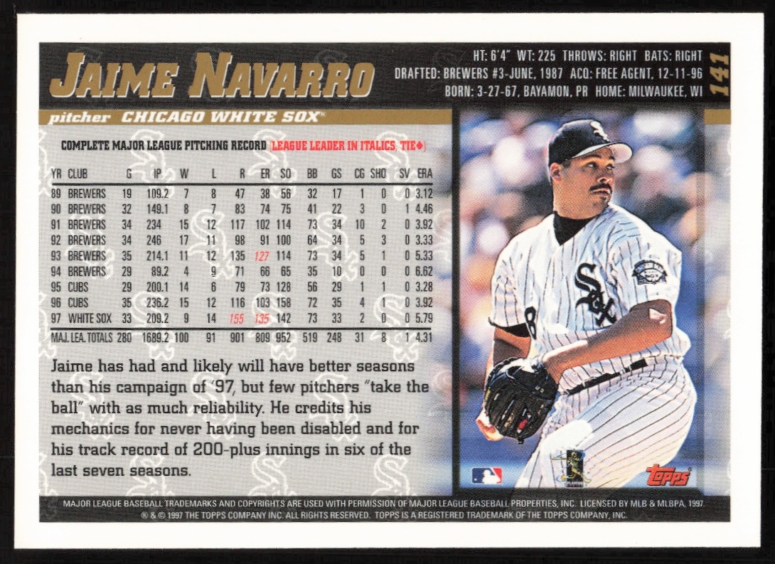 This Baseball card, from 1998 is part of the Topps card set. Jaime Navarro is featured and has a card number of 141.