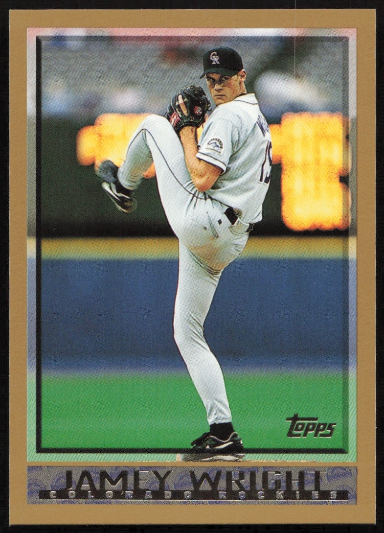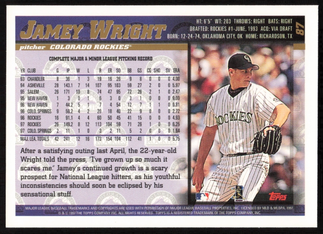 This Baseball card, from 1998 is part of the Topps card set. Jamey Wright is featured and has a card number of 87.