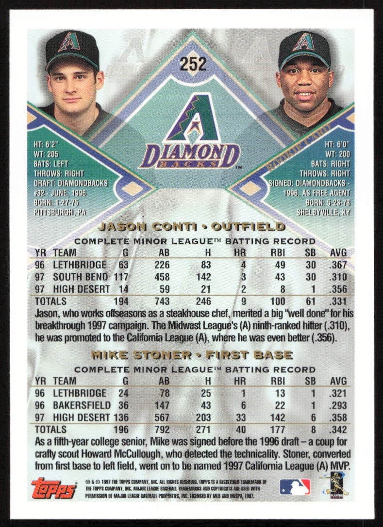 This Baseball card, from 1998 is part of the Topps card set. Jason Conti / Mike Stoner is featured and has a card number of 252.