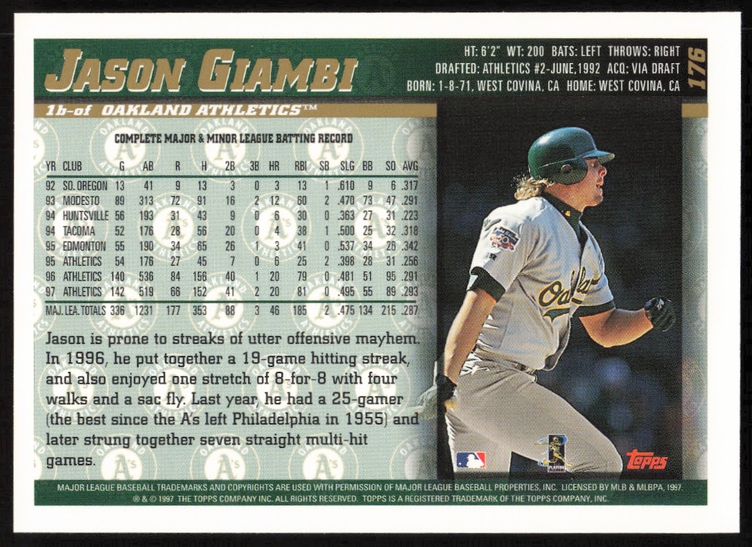 This Baseball card, from 1998 is part of the Topps card set. Jason Giambi is featured and has a card number of 176.
