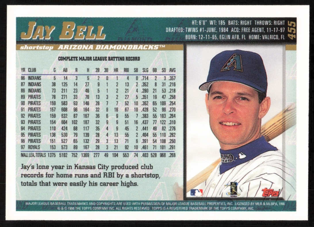 This Baseball card, from 1998 is part of the Topps card set. Jay Bell is featured and has a card number of 455.