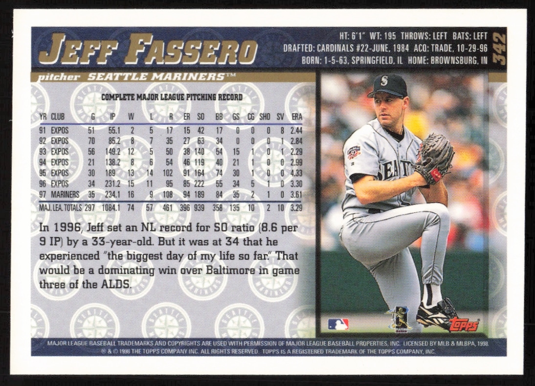This Baseball card, from 1998 is part of the Topps card set. Jeff Fassero is featured and has a card number of 342.