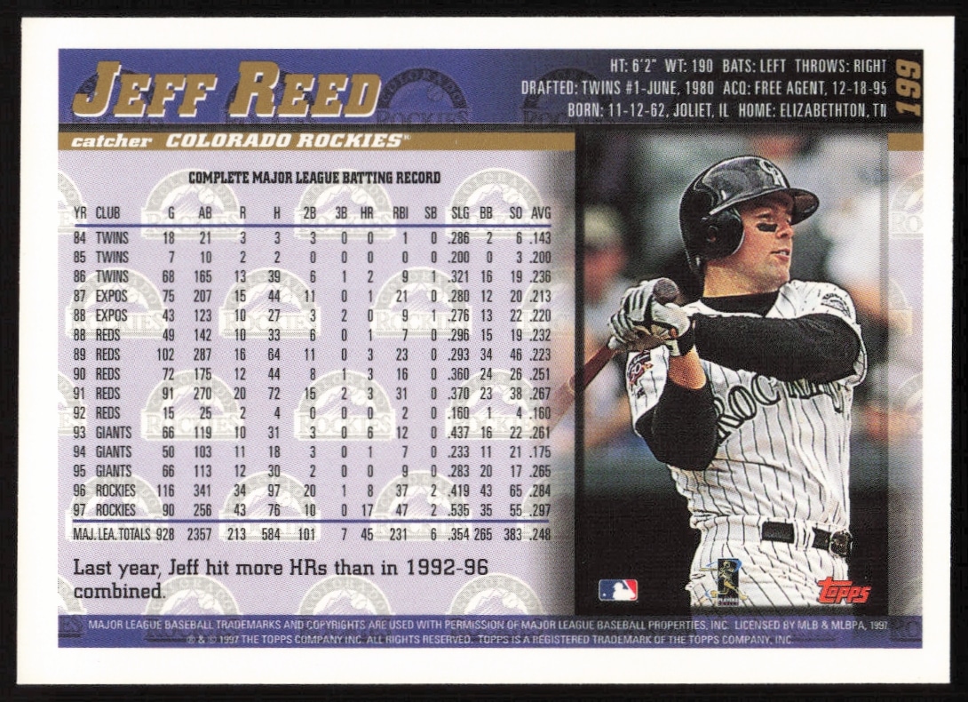 This Baseball card, from 1998 is part of the Topps card set. Jeff Reed is featured and has a card number of 199.