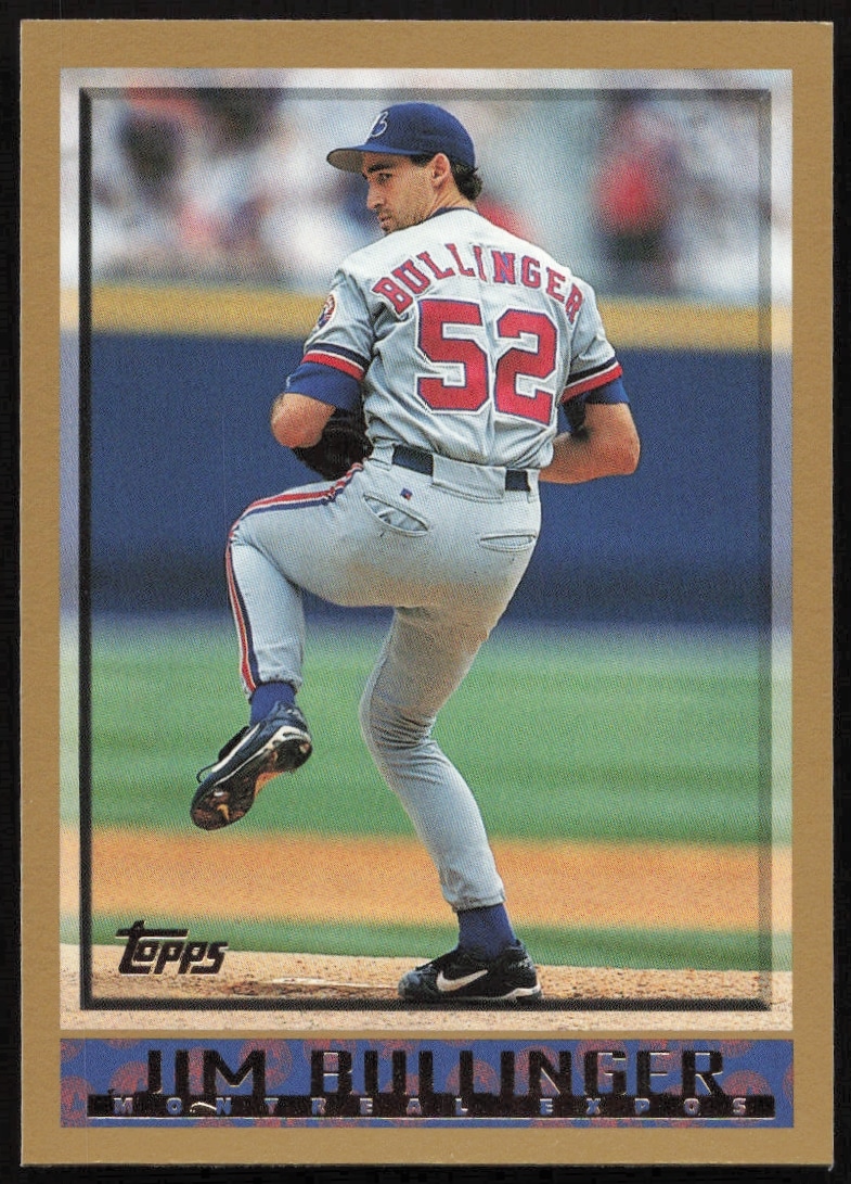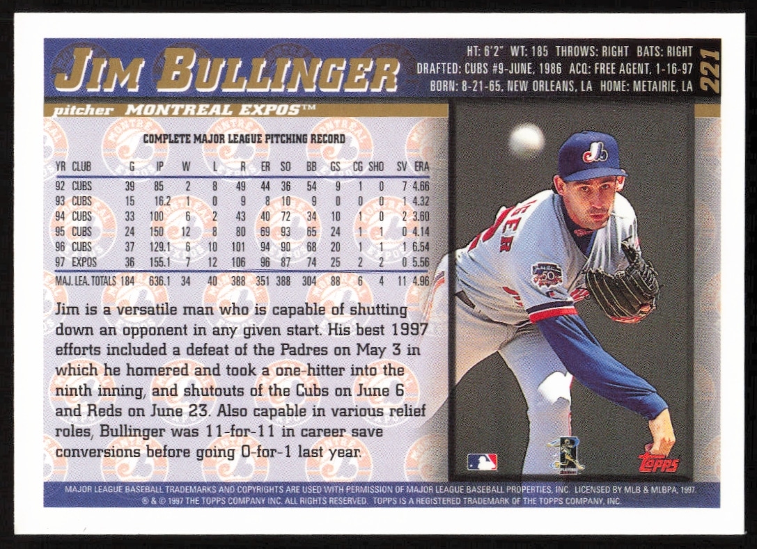 This Baseball card, from 1998 is part of the Topps card set. Jim Bullinger is featured and has a card number of 221.