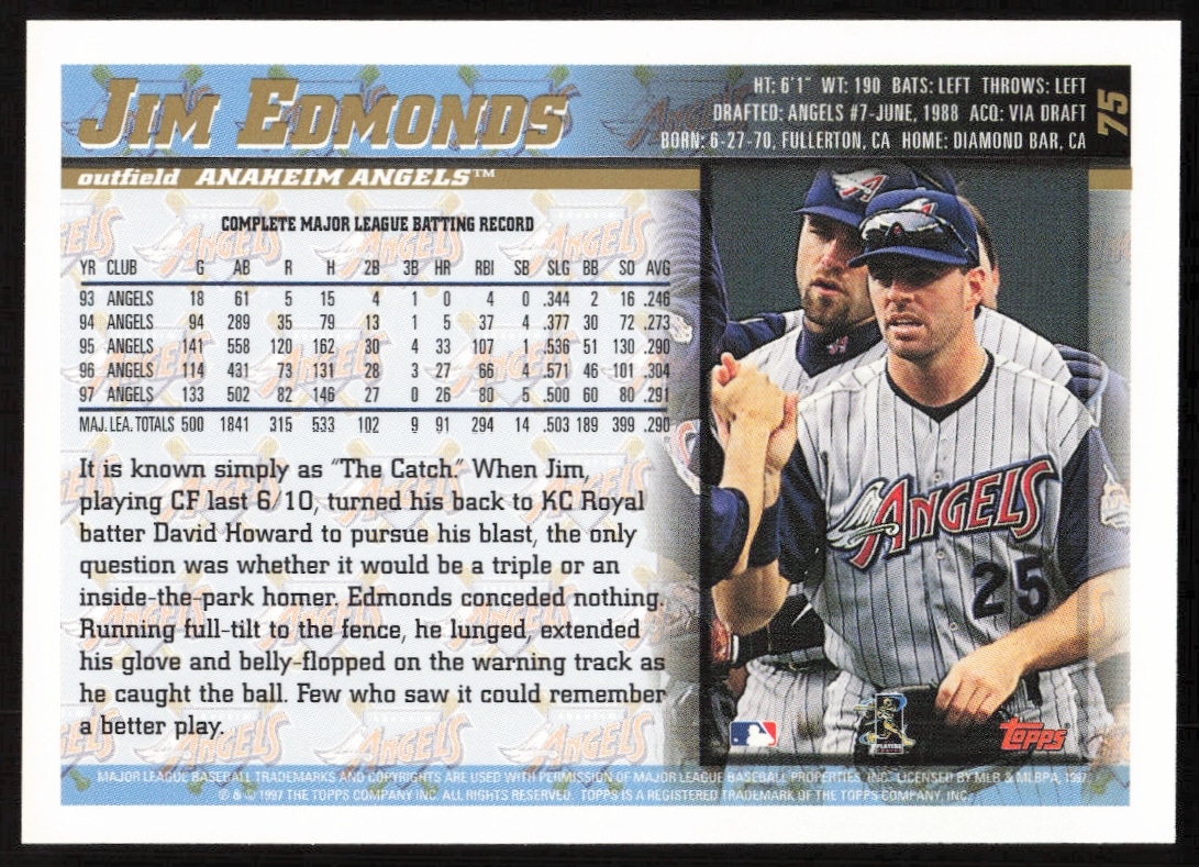 This Baseball card, from 1998 is part of the Topps card set. Jim Edmonds is featured and has a card number of 75.