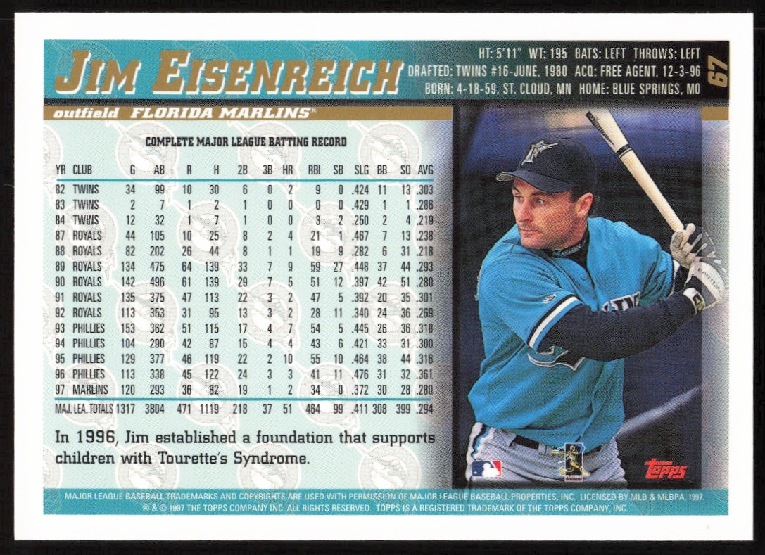 This Baseball card, from 1998 is part of the Topps card set. Jim Eisenreich is featured and has a card number of 67.