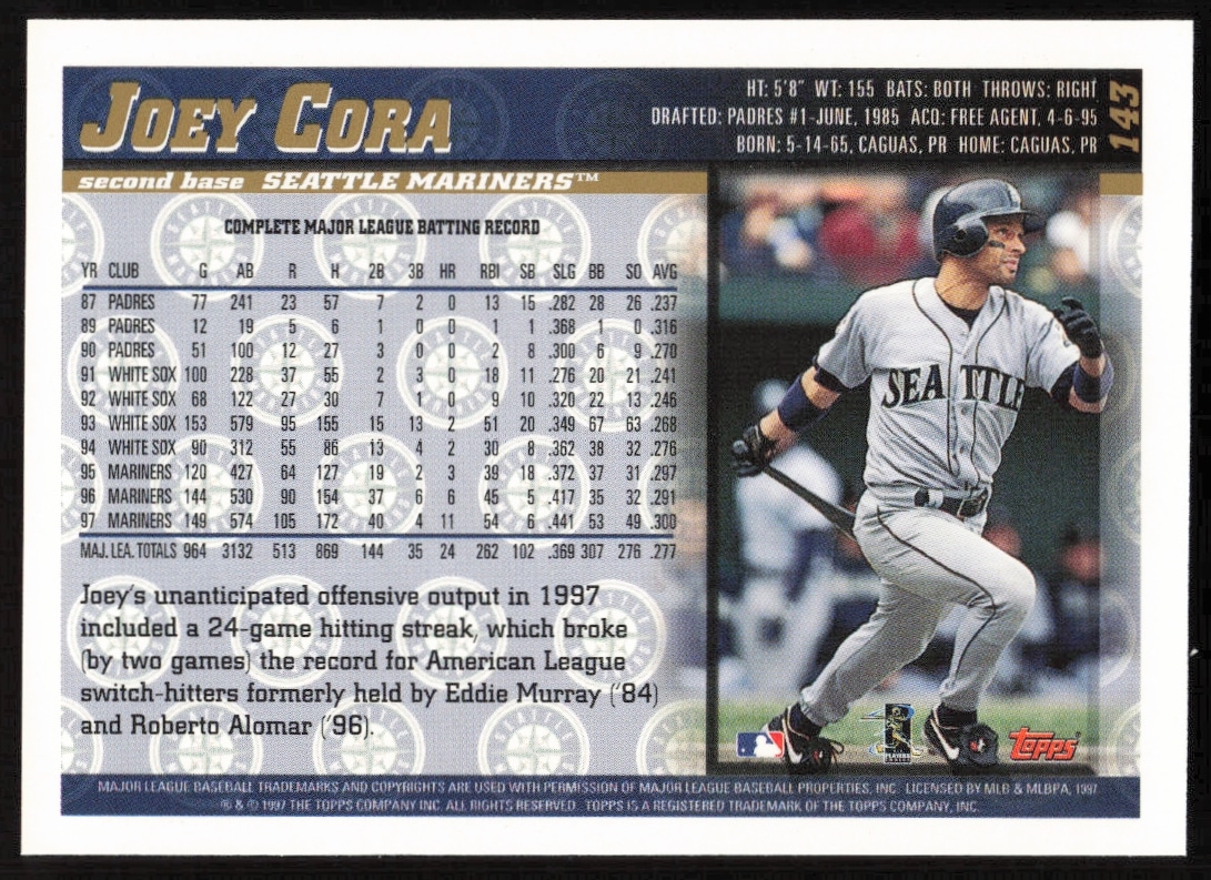 This Baseball card, from 1998 is part of the Topps card set. Joey Cora is featured and has a card number of 143.