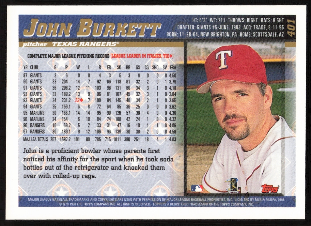 This Baseball card, from 1998 is part of the Topps card set. John Burkett is featured and has a card number of 401.