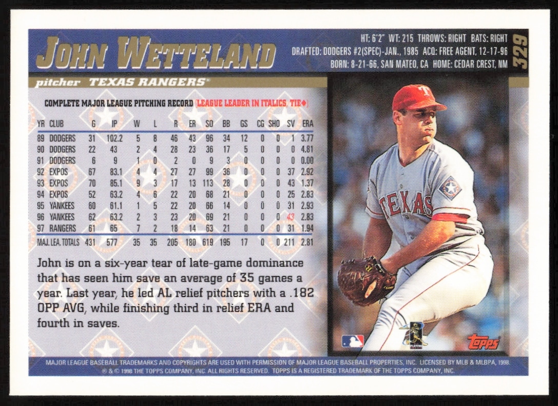 This Baseball card, from 1998 is part of the Topps card set. John Wetteland is featured and has a card number of 329.
