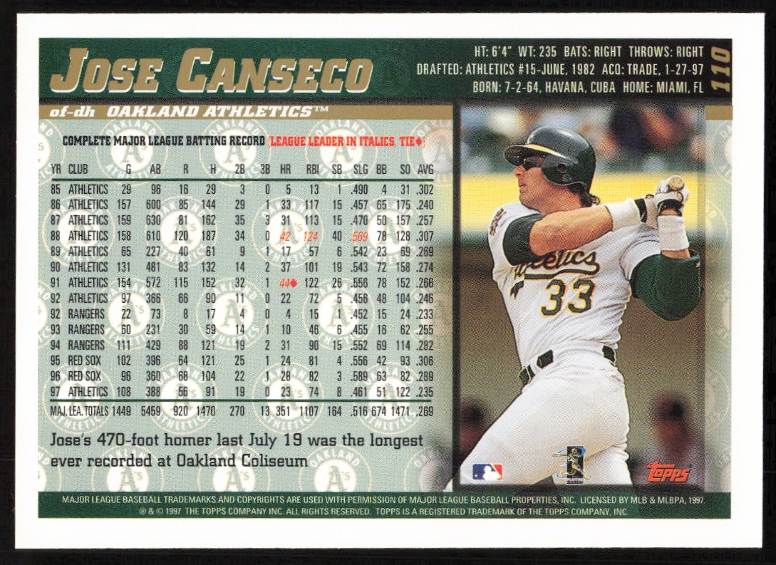 This Baseball card, from 1998 is part of the Topps card set. Jose Canseco is featured and has a card number of 110.