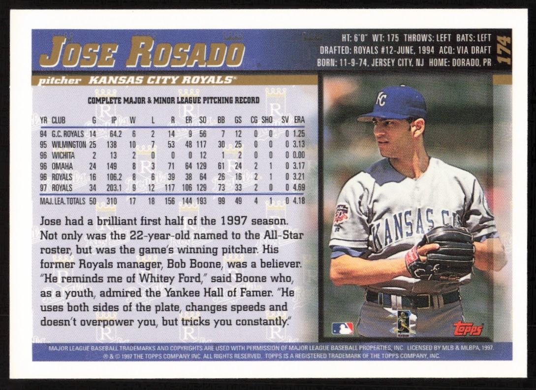 This Baseball card, from 1998 is part of the Topps card set. Jose Rosado is featured and has a card number of 174.