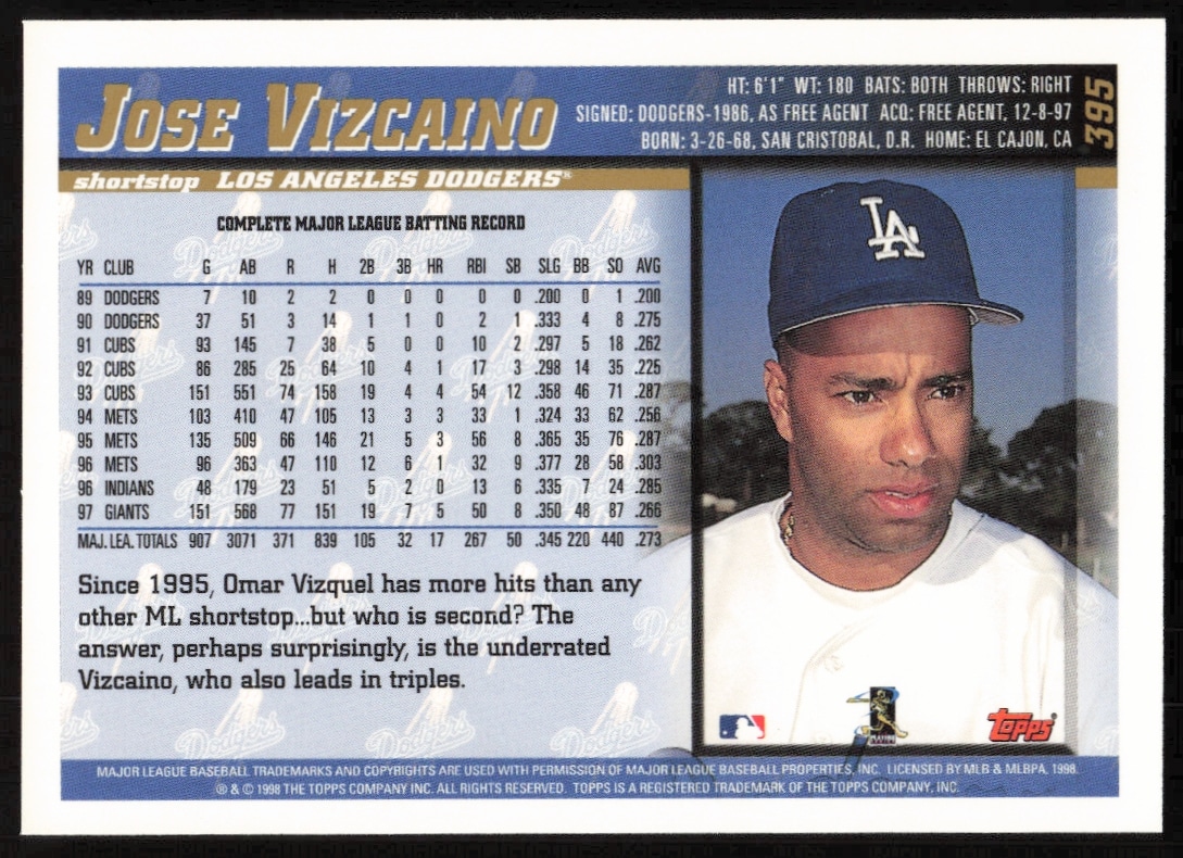 This Baseball card, from 1998 is part of the Topps card set. Jose Vizcaino is featured and has a card number of 395.