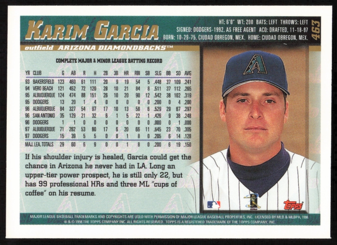 This Baseball card, from 1998 is part of the Topps card set. Karim Garcia is featured and has a card number of 463.