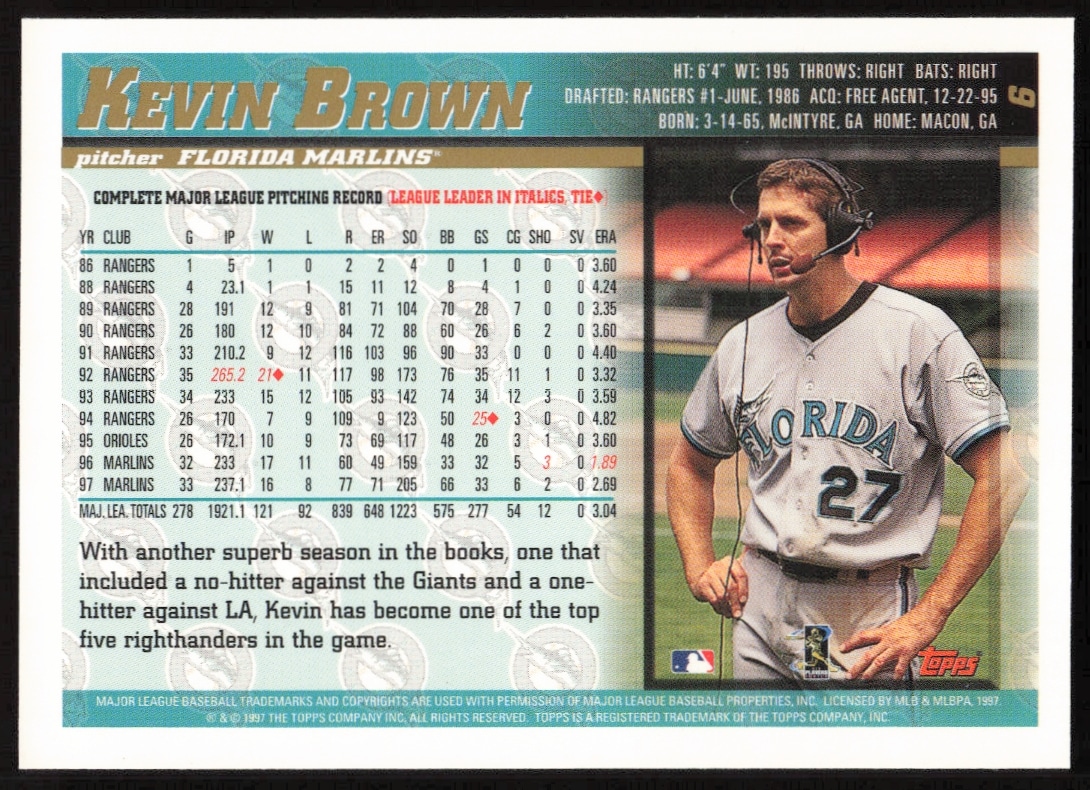 This Baseball card, from 1998 is part of the Topps card set. Kevin Brown is featured and has a card number of 6.