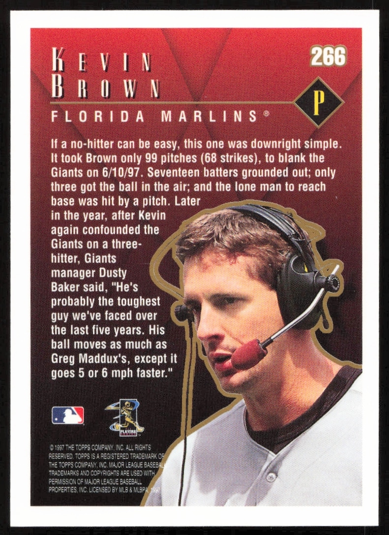 This Baseball card, from 1998 is part of the Topps card set. Kevin Brown is featured and has a card number of 266.