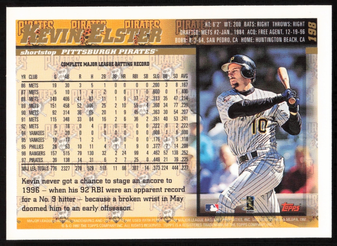 This Baseball card, from 1998 is part of the Topps card set. Kevin Elster is featured and has a card number of 198.