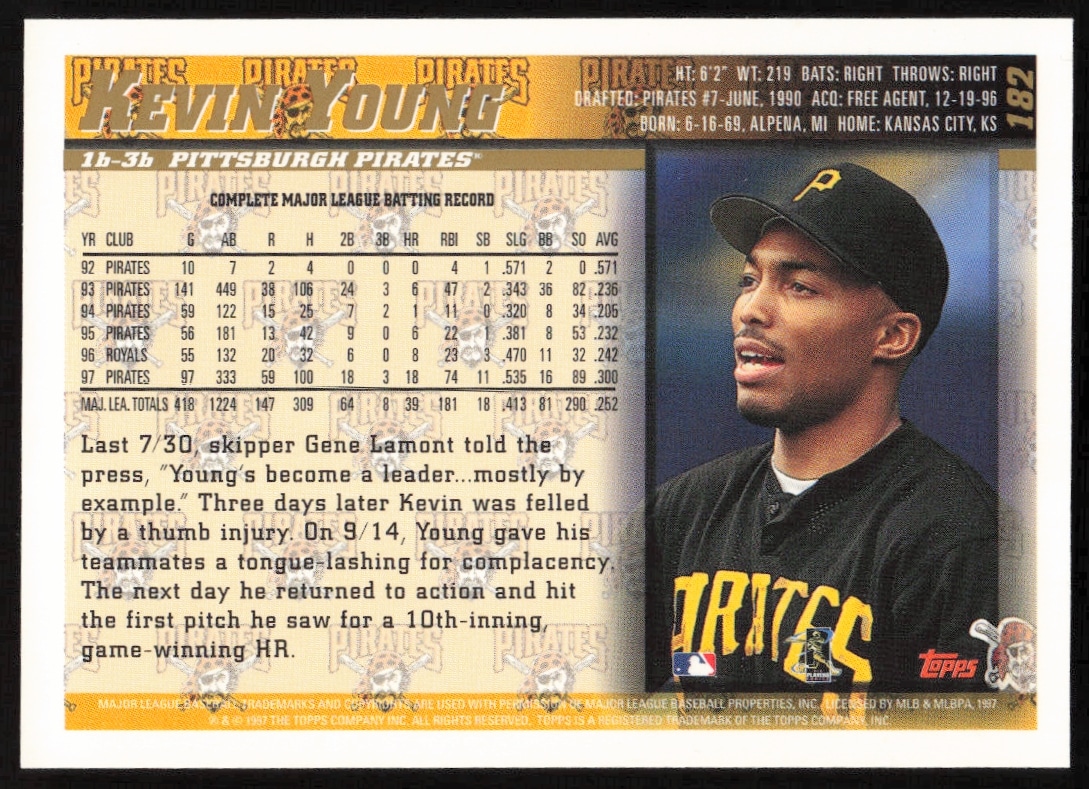This Baseball card, from 1998 is part of the Topps card set. Kevin Young is featured and has a card number of 182.