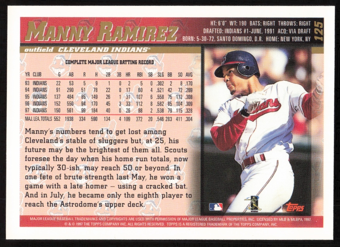 This Baseball card, from 1998 is part of the Topps card set. Manny Ramirez is featured and has a card number of 125.