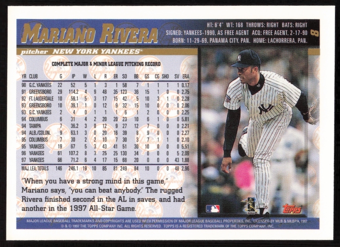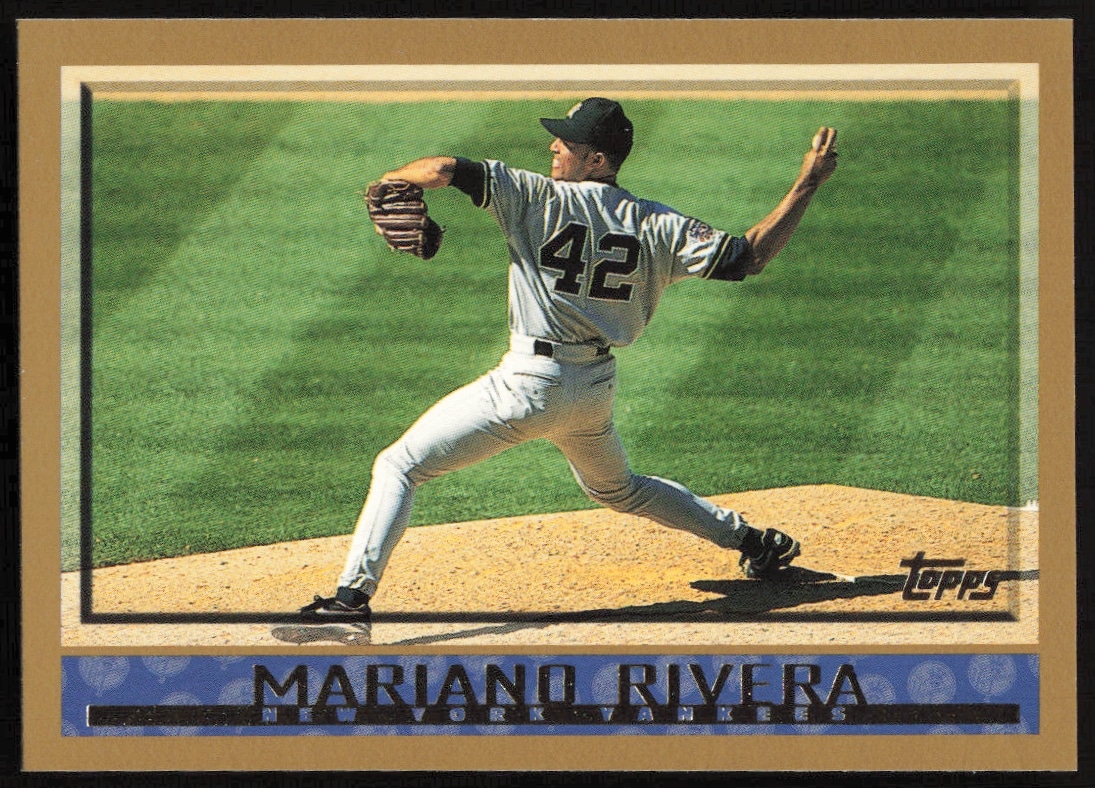 This Baseball card, from 1998 is part of the Topps card set. Mariano Rivera is featured and has a card number of 8.