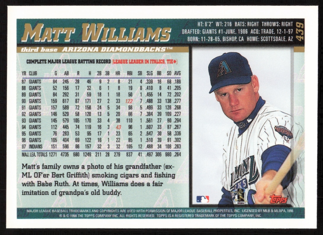 This Baseball card, from 1998 is part of the Topps card set. Matt Williams is featured and has a card number of 439.