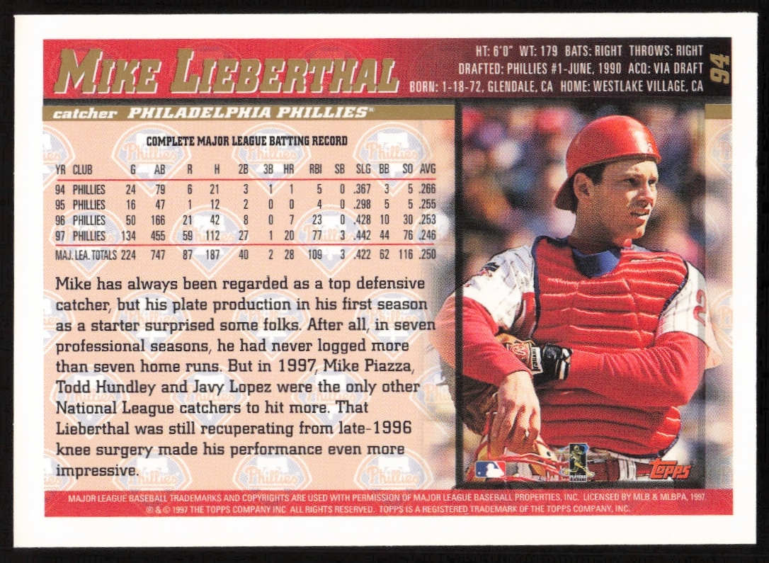 This Baseball card, from 1998 is part of the Topps card set. Mike Lieberthal is featured and has a card number of 94.