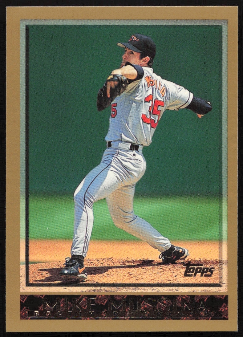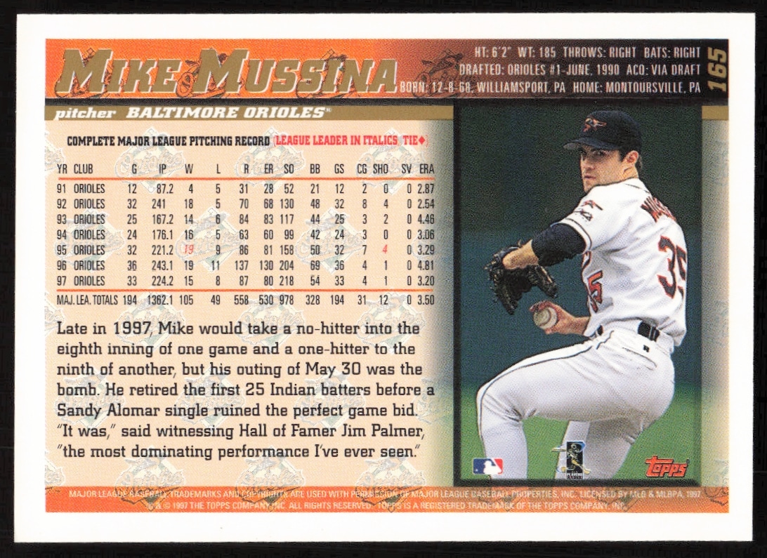 This Baseball card, from 1998 is part of the Topps card set. Mike Mussina is featured and has a card number of 165.