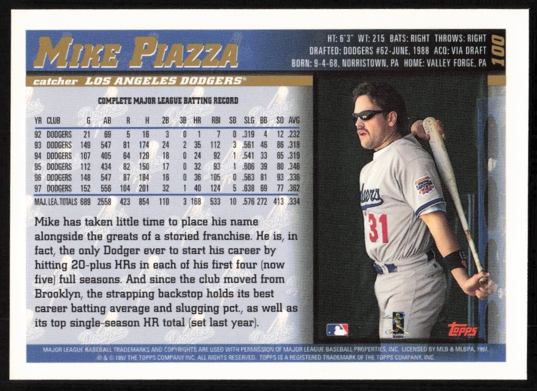 This Baseball card, from 1998 is part of the Topps card set. Mike Piazza is featured and has a card number of 100.