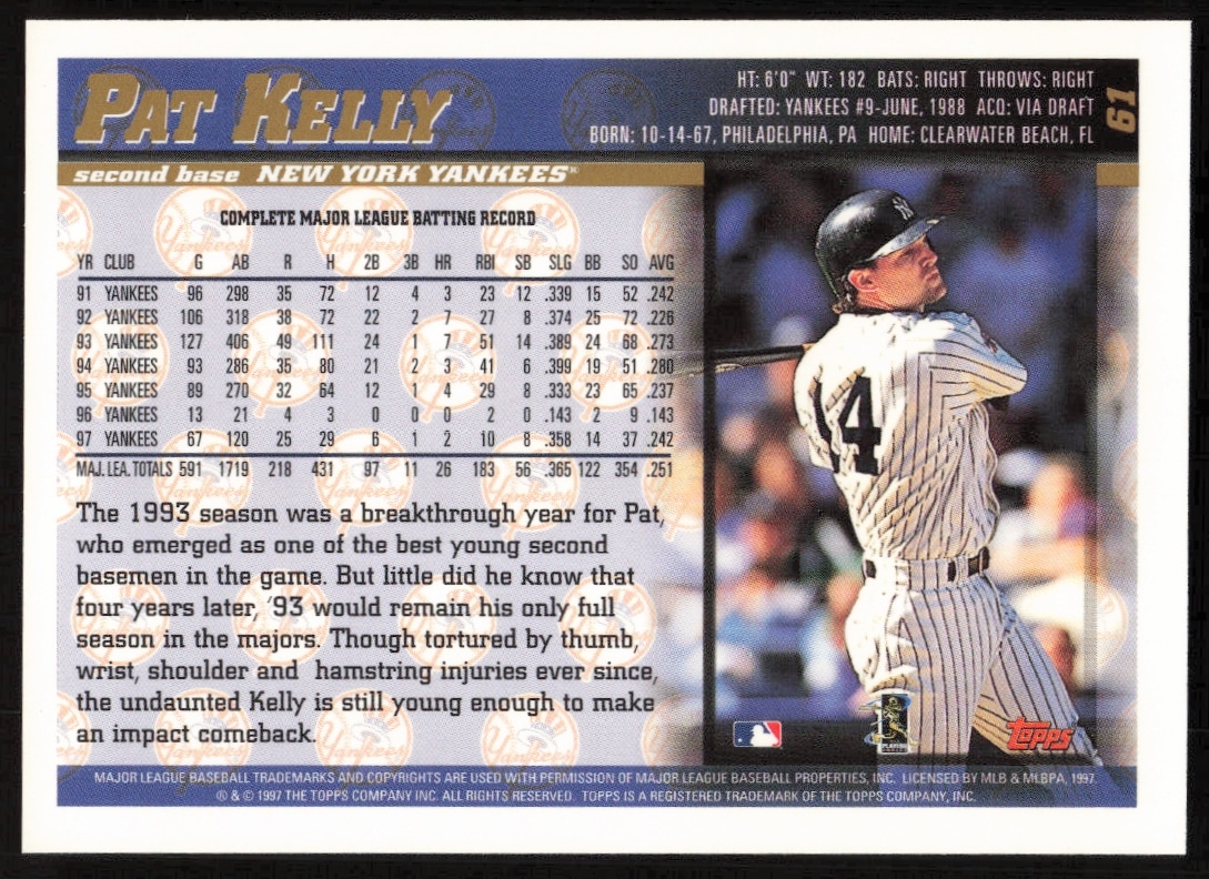 This Baseball card, from 1998 is part of the Topps card set. Pat Kelly is featured and has a card number of 61.