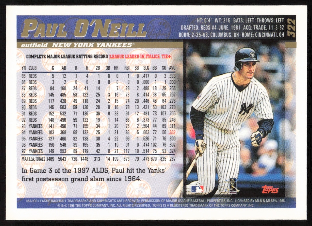 This Baseball card, from 1998 is part of the Topps card set. Paul O’Neill is featured and has a card number of 322.