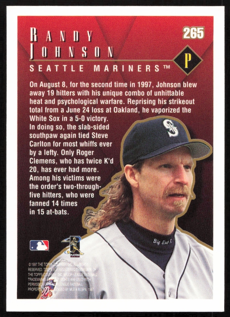 This Baseball card, from 1998 is part of the Topps card set. Randy Johnson is featured and has a card number of 265.