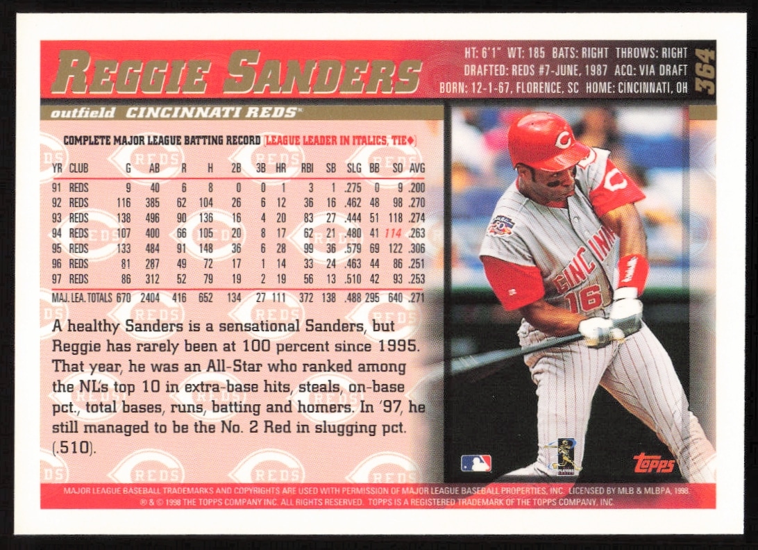 This Baseball card, from 1998 is part of the Topps card set. Reggie Sanders is featured and has a card number of 364.