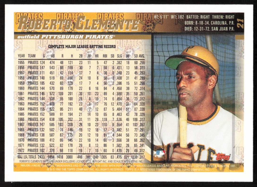 This Baseball card, from 1998 is part of the Topps card set. Roberto Clemente is featured and has a card number of 21.
