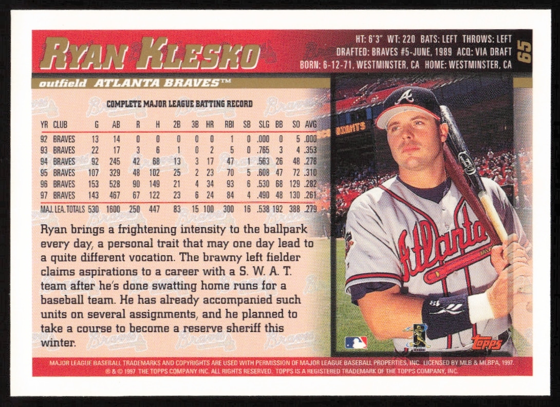 This Baseball card, from 1998 is part of the Topps card set. Ryan Klesko is featured and has a card number of 65.