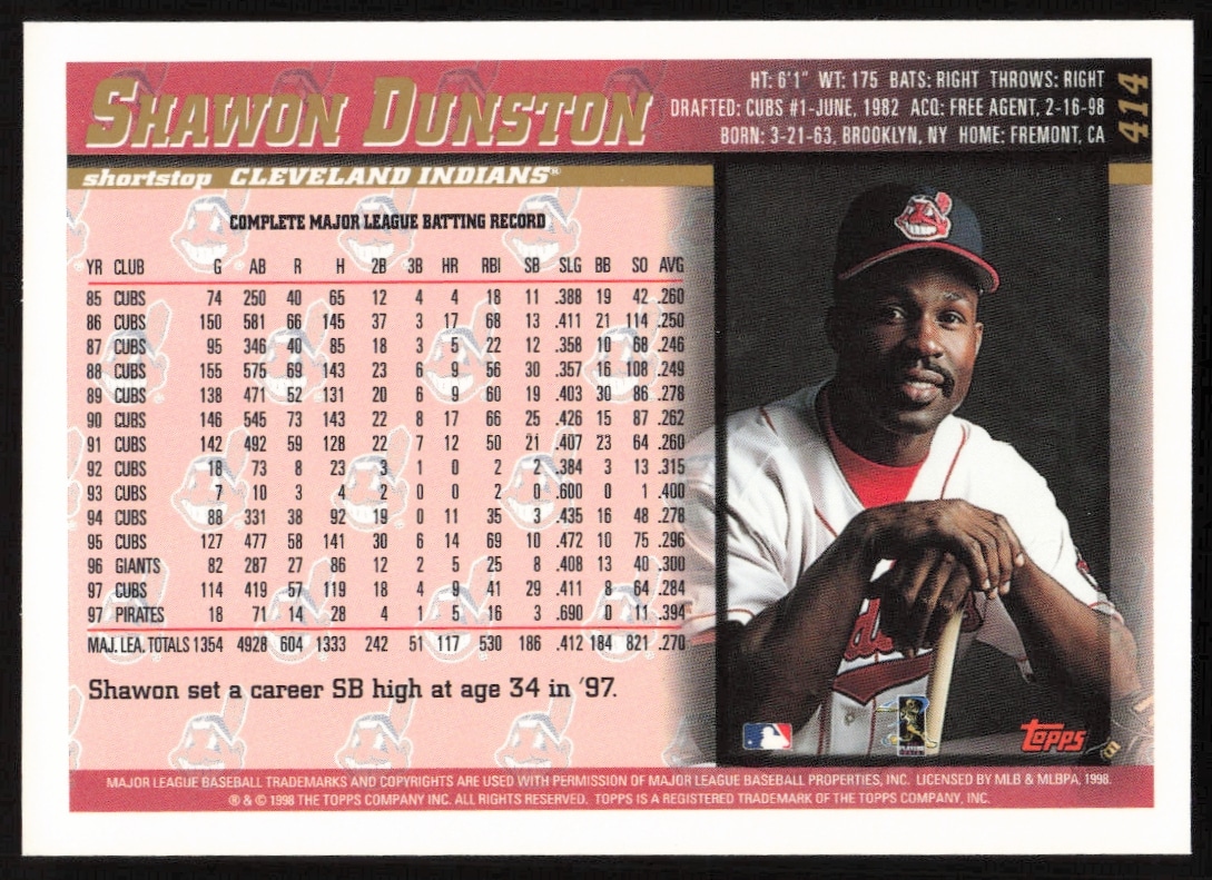 This Baseball card, from 1998 is part of the Topps card set. Shawon Dunston is featured and has a card number of 414.