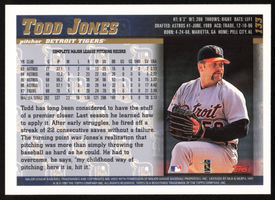 This Baseball card, from 1998 is part of the Topps card set. Todd Jones is featured and has a card number of 133.