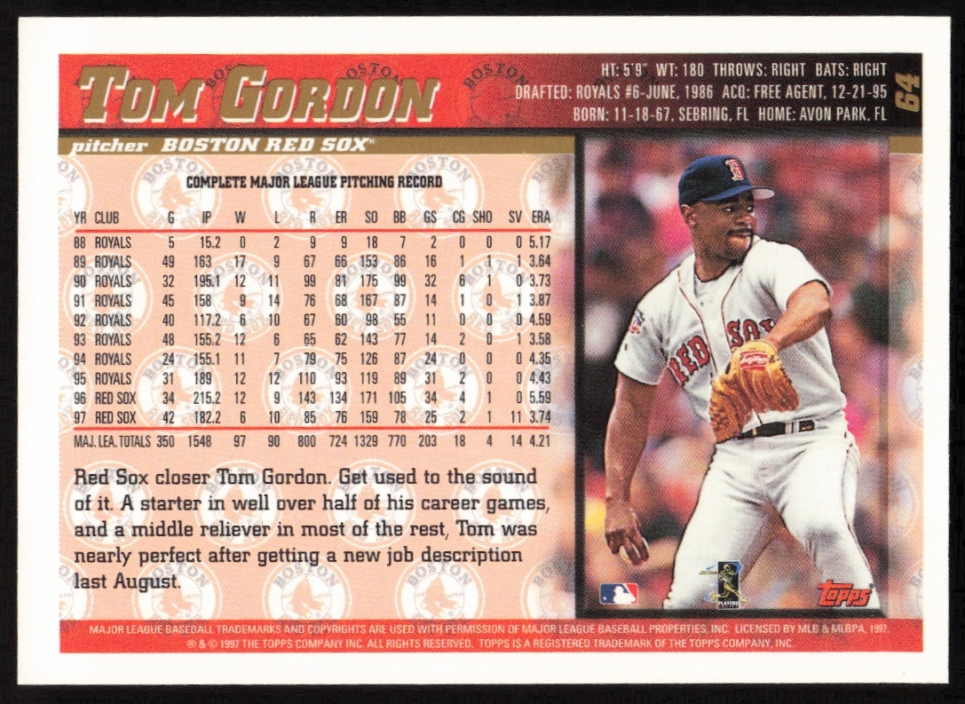 This Baseball card, from 1998 is part of the Topps card set. Tom Gordon is featured and has a card number of 64.