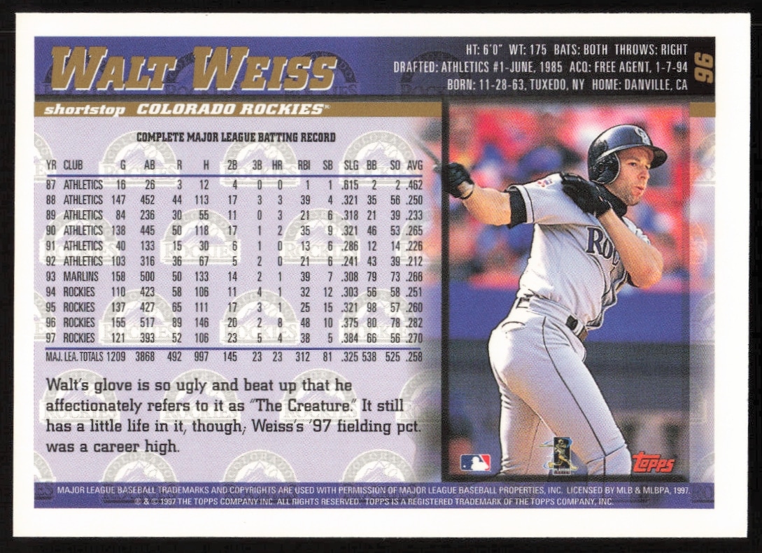 This Baseball card, from 1998 is part of the Topps card set. Walt Weiss is featured and has a card number of 96.