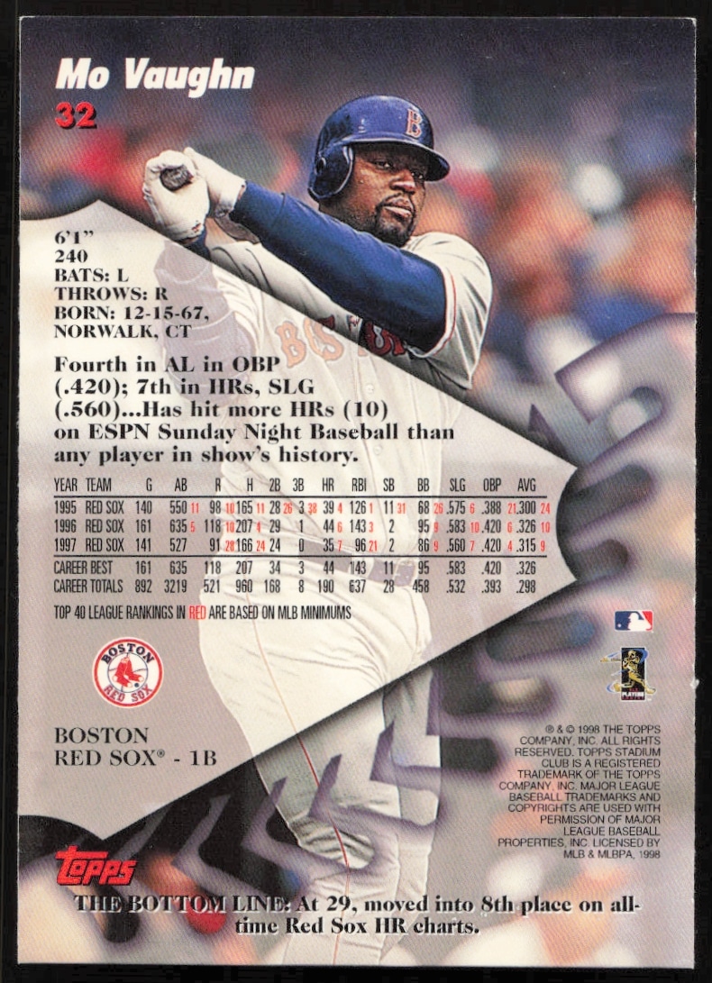 This Baseball card, from 1998 is part of the Upper Deck card set. Mo Vaughn is featured and has a card number of 32.