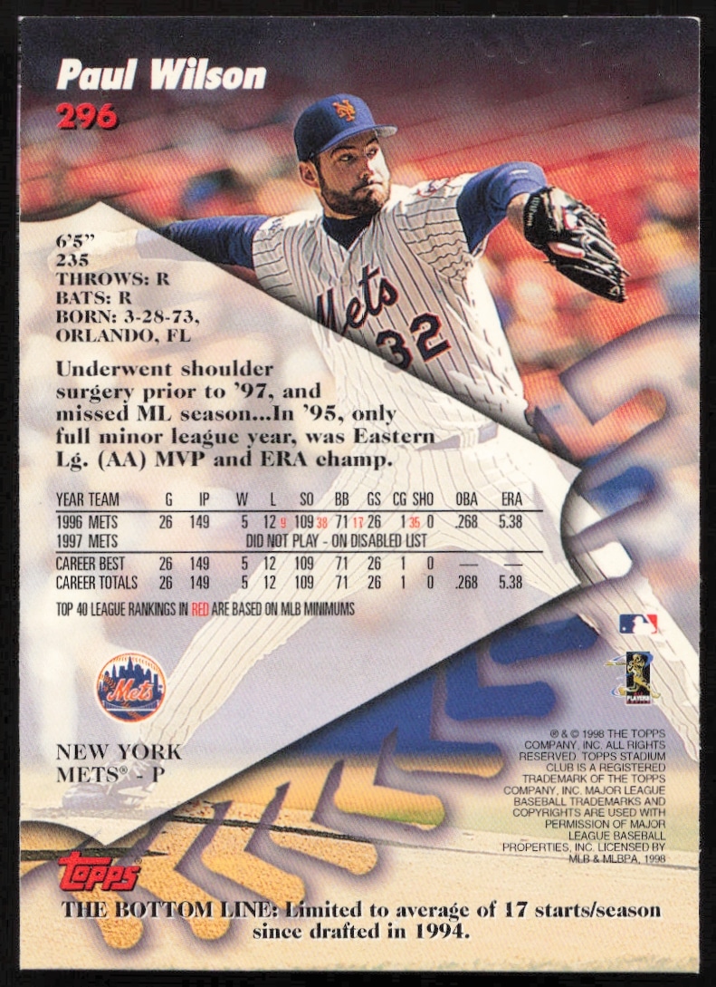 This Baseball card, from 1998 is part of the Upper Deck card set. Paul Wilson is featured and has a card number of 296.
