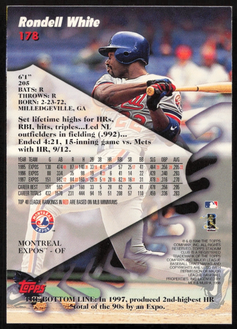 This Baseball card, from 1998 is part of the Upper Deck card set. Rondell White is featured and has a card number of 178.