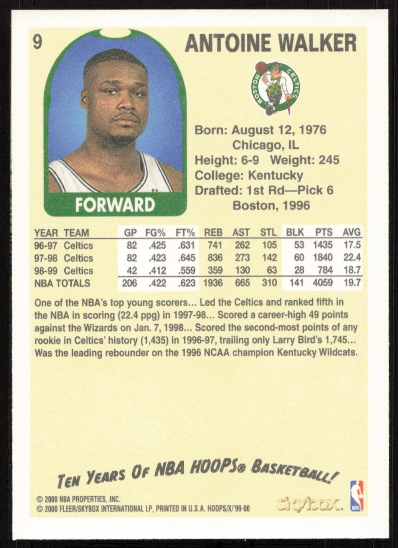 This Basketball card, from 1999-00 is part of the Skybox NBA Hoops Decade card set. Antoine Walker is featured and has a card number of 9.