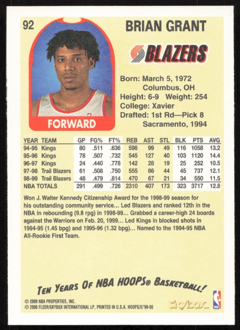 This Basketball card, from 1999-00 is part of the Skybox NBA Hoops Decade card set. Brian Grant is featured and has a card number of 92.