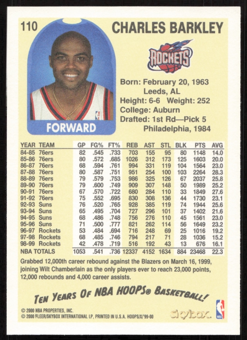 This Basketball card, from 1999-00 is part of the Skybox NBA Hoops Decade card set. Charles Barkley is featured and has a card number of 110.