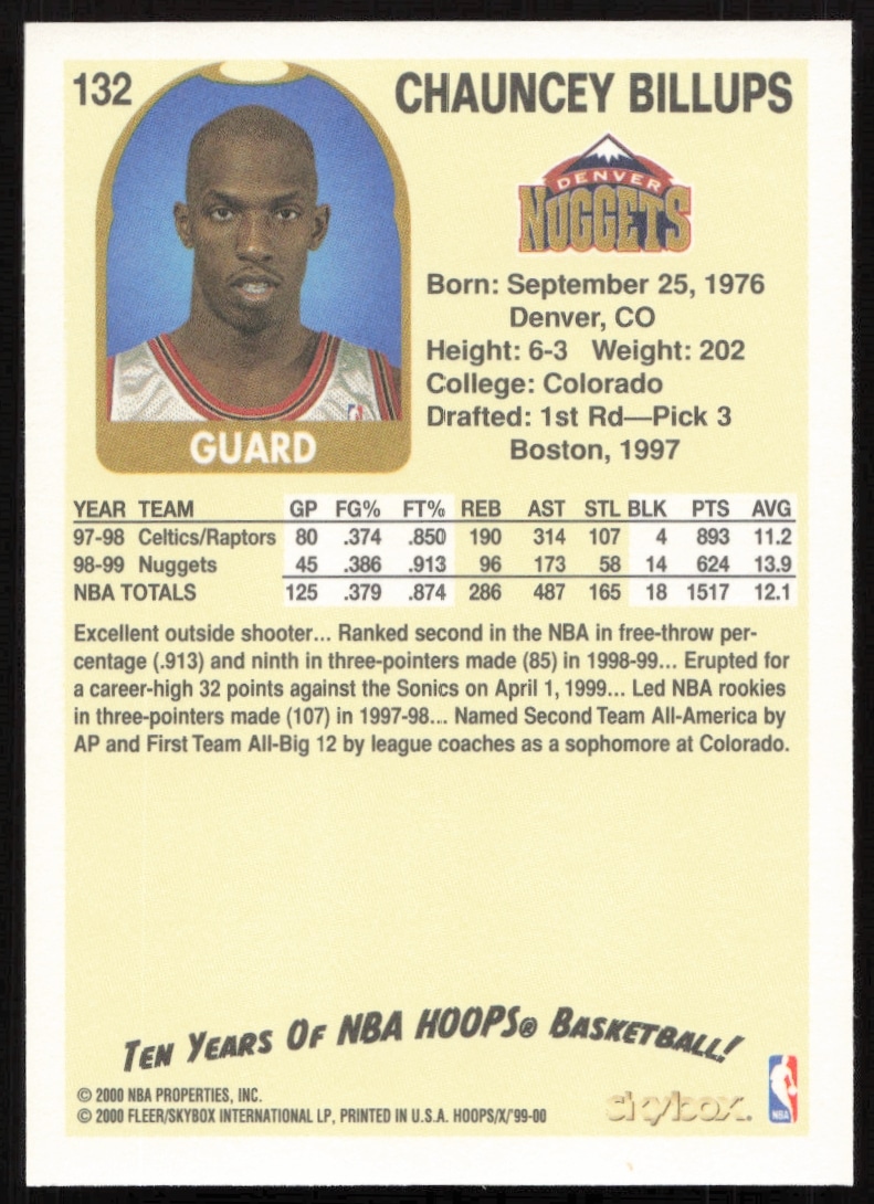 This Basketball card, from 1999-00 is part of the Skybox NBA Hoops Decade card set. Chauncey Billups is featured and has a card number of 132.