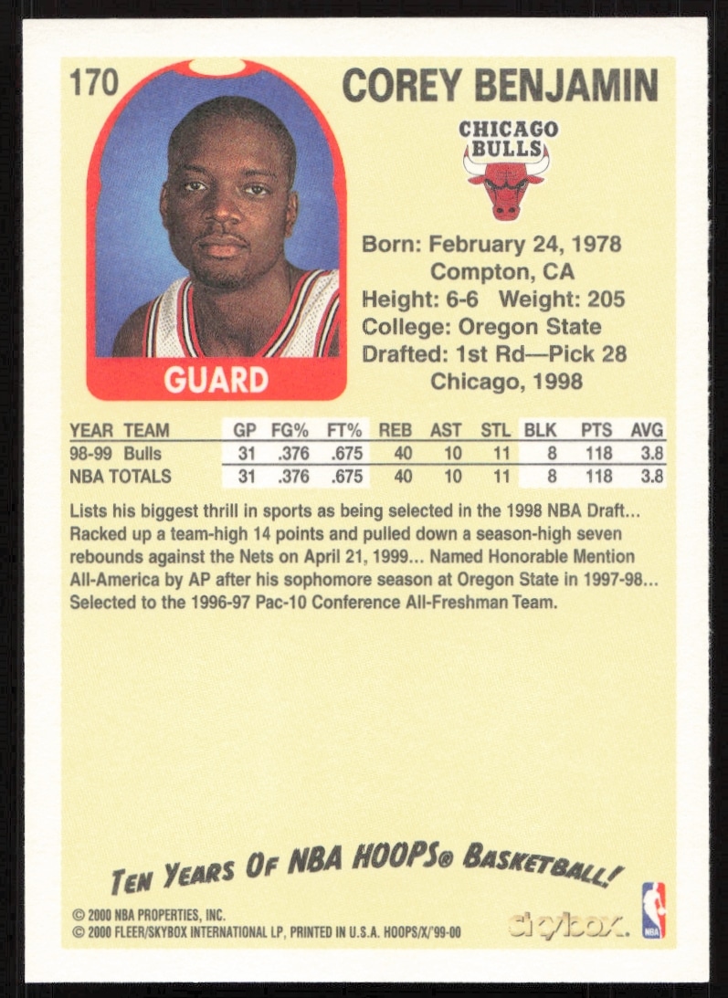 This Basketball card, from 1999-00 is part of the Skybox NBA Hoops Decade card set. Corey Benjamin is featured and has a card number of 170.